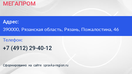 МЕГАПРОМ по адресу 390000, Рязанская область, Рязань, Пожалостина, 46 в дальнейшем Организация, размещена в следующих категориях: