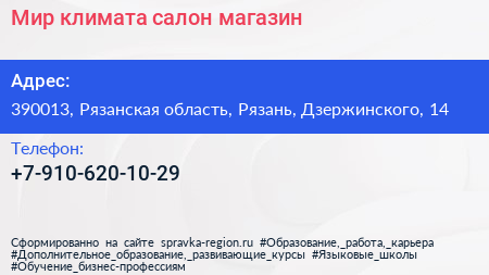 Мир климата, салон-магазин по адресу 390013, Рязанская область, Рязань, Дзержинского, 14 в дальнейшем Организация, размещена в следующих категориях: