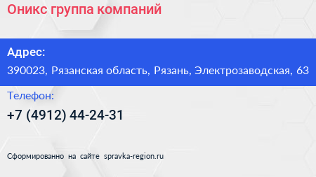 Оникс, группа компаний по адресу 390023, Рязанская область, Рязань, Электрозаводская, 63 в дальнейшем Организация, размещена в следующих категориях: