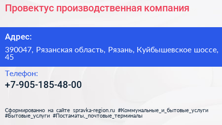Провектус, производственная компания по адресу 390047, Рязанская область, Рязань, Куйбышевское шоссе, 45 в дальнейшем Организация, размещена в следующих категориях: