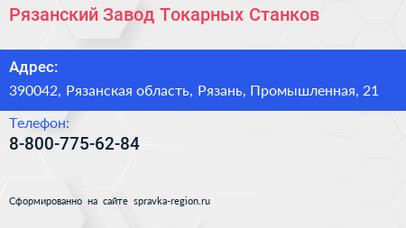 Рязанский Завод Токарных Станков по адресу 390042, Рязанская область, Рязань, Промышленная, 21 в дальнейшем Организация, размещена в следующих категориях: