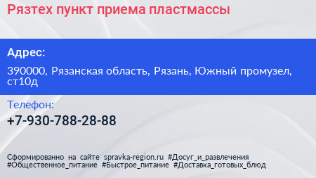 Рязтех, пункт приема пластмассы по адресу 390000, Рязанская область, Рязань, Южный промузел, ст10д в дальнейшем Организация, размещена в следующих категориях: