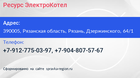 Ресурс-ЭлектроКотел по адресу 390005, Рязанская область, Рязань, Дзержинского, 64/1 в дальнейшем Организация, размещена в следующих категориях: