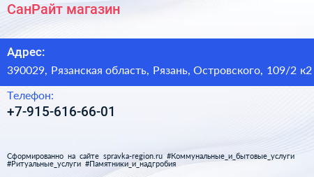 СанРайт, магазин по адресу 390029, Рязанская область, Рязань, Островского, 109/2 к2 в дальнейшем Организация, размещена в следующих категориях: