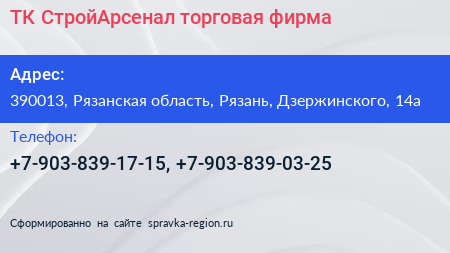 ТК СтройАрсенал, торговая фирма по адресу 390013, Рязанская область, Рязань, Дзержинского, 14а в дальнейшем Организация, размещена в следующих категориях: