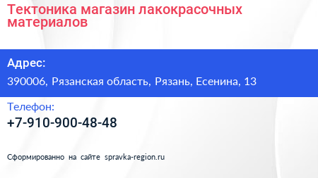 Тектоника, магазин лакокрасочных материалов по адресу 390006, Рязанская область, Рязань, Есенина, 13 в дальнейшем Организация, размещена в следующих категориях: