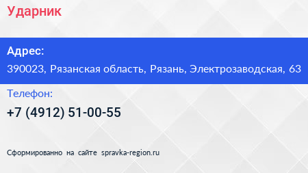 Ударник по адресу 390023, Рязанская область, Рязань, Электрозаводская, 63 в дальнейшем Организация, размещена в следующих категориях: