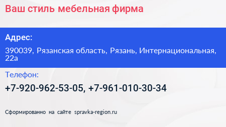Ваш стиль, мебельная фирма по адресу 390039, Рязанская область, Рязань, Интернациональная, 22а в дальнейшем Организация, размещена в следующих категориях: