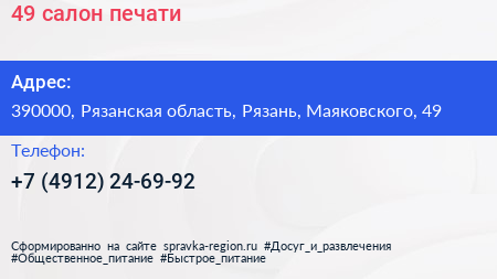 49, салон печати по адресу 390000, Рязанская область, Рязань, Маяковского, 49 в дальнейшем Организация, размещена в следующих категориях: