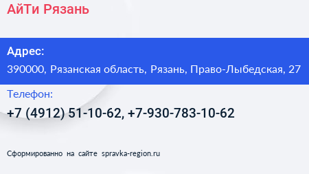 АйТи Рязань по адресу 390000, Рязанская область, Рязань, Право-Лыбедская, 27 в дальнейшем Организация, размещена в следующих категориях: