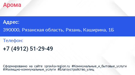 Арома по адресу 390000, Рязанская область, Рязань, Каширина, 1Б в дальнейшем Организация, размещена в следующих категориях: