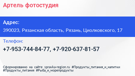 Артель, фотостудия по адресу 390023, Рязанская область, Рязань, Циолковского, 17 в дальнейшем Организация, размещена в следующих категориях: