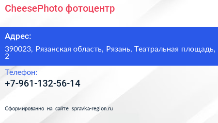 CheesePhoto, фотоцентр по адресу 390023, Рязанская область, Рязань, Театральная площадь, 2 в дальнейшем Организация, размещена в следующих категориях: