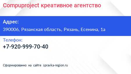Compuproject, креативное агентство по адресу 390006, Рязанская область, Рязань, Есенина, 1а в дальнейшем Организация, размещена в следующих категориях: