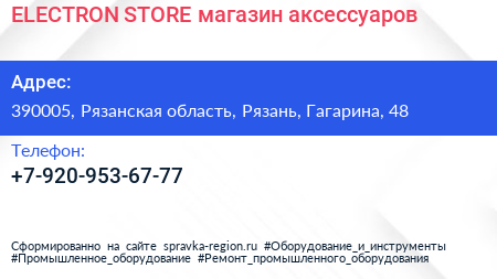 ELECTRON STORE, магазин аксессуаров по адресу 390005, Рязанская область, Рязань, Гагарина, 48 в дальнейшем Организация, размещена в следующих категориях: