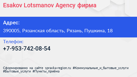 Esakov Lotsmanov Agency, фирма по адресу 390005, Рязанская область, Рязань, Пушкина, 18 в дальнейшем Организация, размещена в следующих категориях: