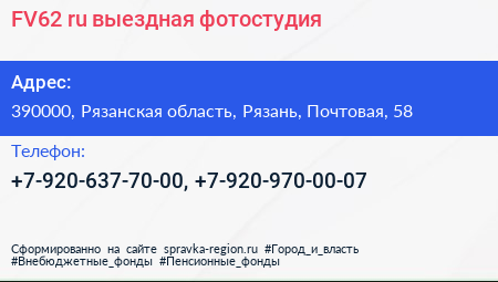 FV62.ru, выездная фотостудия по адресу 390000, Рязанская область, Рязань, Почтовая, 58 в дальнейшем Организация, размещена в следующих категориях: