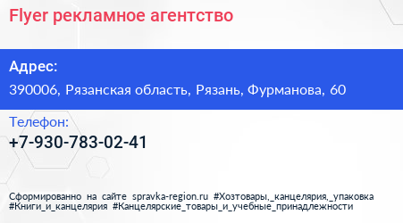 Flyer, рекламное агентство по адресу 390006, Рязанская область, Рязань, Фурманова, 60 в дальнейшем Организация, размещена в следующих категориях: