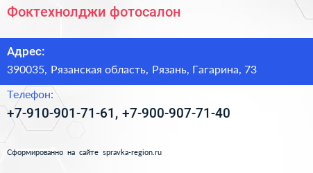 Фоктехнолджи, фотосалон по адресу 390035, Рязанская область, Рязань, Гагарина, 73 в дальнейшем Организация, размещена в следующих категориях: