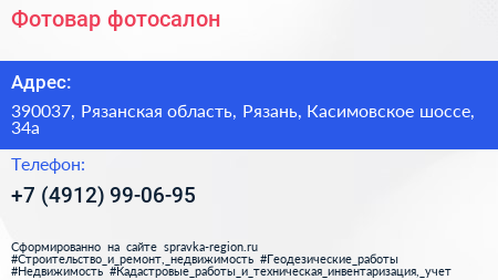 Фотовар, фотосалон по адресу 390037, Рязанская область, Рязань, Касимовское шоссе, 34а в дальнейшем Организация, размещена в следующих категориях: