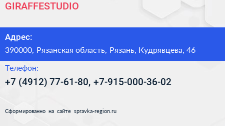 GIRAFFESTUDIO по адресу 390000, Рязанская область, Рязань, Кудрявцева, 46 в дальнейшем Организация, размещена в следующих категориях: