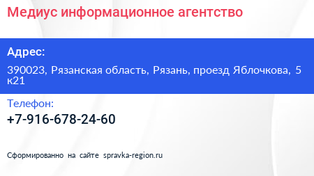 Медиус, информационное агентство по адресу 390023, Рязанская область, Рязань, проезд Яблочкова, 5 к21 в дальнейшем Организация, размещена в следующих категориях: