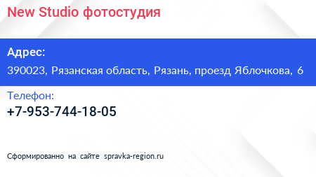 New Studio, фотостудия по адресу 390023, Рязанская область, Рязань, проезд Яблочкова, 6 в дальнейшем Организация, размещена в следующих категориях:
