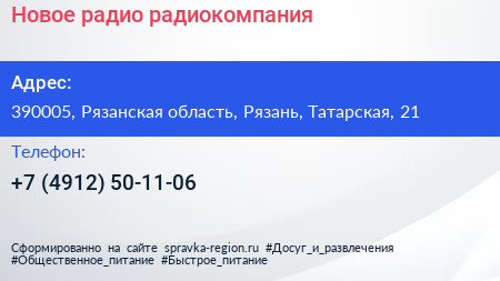 Новое радио, радиокомпания по адресу 390005, Рязанская область, Рязань, Татарская, 21 в дальнейшем Организация, размещена в следующих категориях: