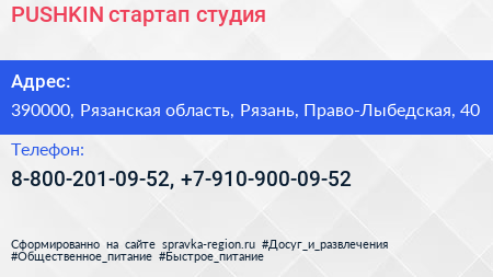 PUSHKIN, стартап-студия по адресу 390000, Рязанская область, Рязань, Право-Лыбедская, 40 в дальнейшем Организация, размещена в следующих категориях: