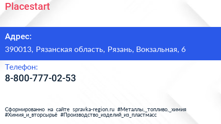 Placestart по адресу 390013, Рязанская область, Рязань, Вокзальная, 6 в дальнейшем Организация, размещена в следующих категориях: