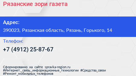 Рязанские зори, газета по адресу 390023, Рязанская область, Рязань, Горького, 14 в дальнейшем Организация, размещена в следующих категориях: