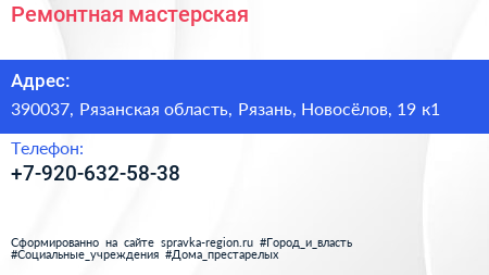 Ремонтная мастерская по адресу 390037, Рязанская область, Рязань, Новосёлов, 19 к1 в дальнейшем Организация, размещена в следующих категориях: