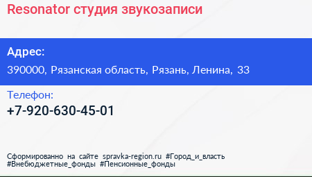 Resonator, студия звукозаписи по адресу 390000, Рязанская область, Рязань, Ленина, 33 в дальнейшем Организация, размещена в следующих категориях: