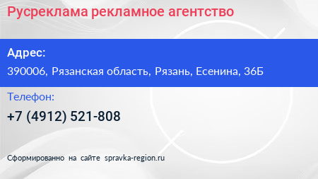Русреклама, рекламное агентство по адресу 390006, Рязанская область, Рязань, Есенина, 36Б в дальнейшем Организация, размещена в следующих категориях: