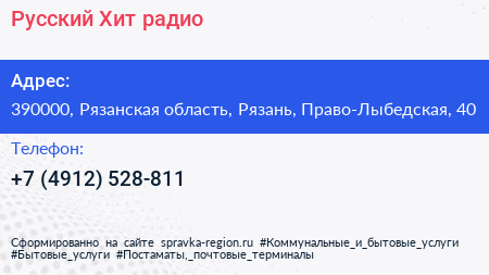 Русский Хит, радио по адресу 390000, Рязанская область, Рязань, Право-Лыбедская, 40 в дальнейшем Организация, размещена в следующих категориях: