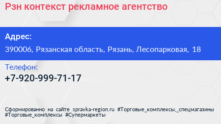 Рзн контекст, рекламное агентство по адресу 390006, Рязанская область, Рязань, Лесопарковая, 18 в дальнейшем Организация, размещена в следующих категориях: