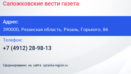 Сапожковские вести, газета по адресу 390000, Рязанская область, Рязань, Горького, 86 в дальнейшем Организация, размещена в следующих категориях:
