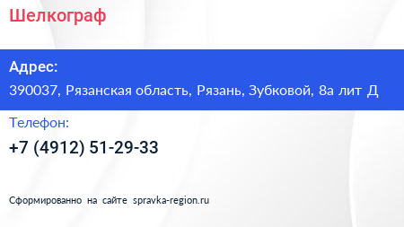 Шелкограф по адресу 390037, Рязанская область, Рязань, Зубковой, 8а лит Д в дальнейшем Организация, размещена в следующих категориях: