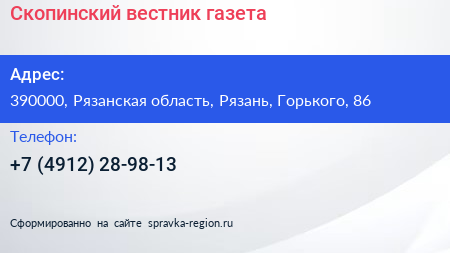 Скопинский вестник, газета по адресу 390000, Рязанская область, Рязань, Горького, 86 в дальнейшем Организация, размещена в следующих категориях: