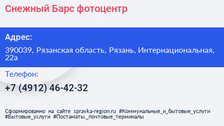 Снежный Барс, фотоцентр по адресу 390039, Рязанская область, Рязань, Интернациональная, 22а в дальнейшем Организация, размещена в следующих категориях: