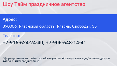 Шоу Тайм, праздничное агентство по адресу 390006, Рязанская область, Рязань, Свободы, 35 в дальнейшем Организация, размещена в следующих категориях: