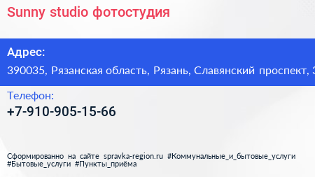 Sunny studio, фотостудия по адресу 390035, Рязанская область, Рязань, Славянский проспект, 3 в дальнейшем Организация, размещена в следующих категориях: