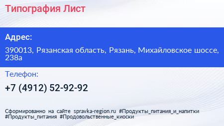 Типография Лист по адресу 390013, Рязанская область, Рязань, Михайловское шоссе, 238а в дальнейшем Организация, размещена в следующих категориях: