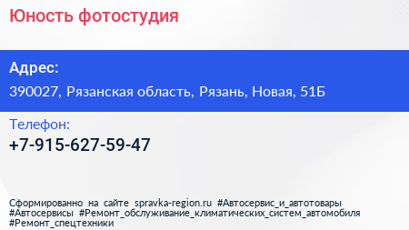 Юность, фотостудия по адресу 390027, Рязанская область, Рязань, Новая, 51Б в дальнейшем Организация, размещена в следующих категориях: