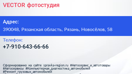 VECTOR, фотостудия по адресу 390048, Рязанская область, Рязань, Новосёлов, 58 в дальнейшем Организация, размещена в следующих категориях: