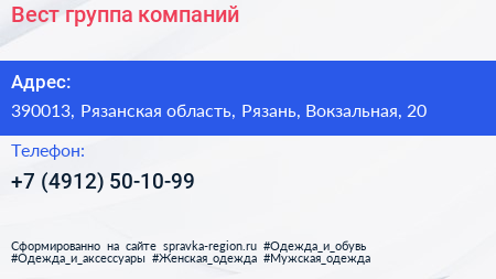 Вест, группа компаний по адресу 390013, Рязанская область, Рязань, Вокзальная, 20 в дальнейшем Организация, размещена в следующих категориях: