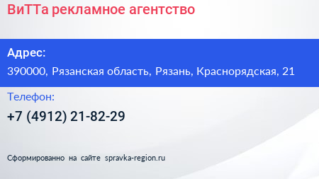 ВиТТа, рекламное агентство по адресу 390000, Рязанская область, Рязань, Краснорядская, 21 в дальнейшем Организация, размещена в следующих категориях: