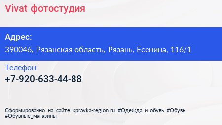 Vivat, фотостудия по адресу 390046, Рязанская область, Рязань, Есенина, 116/1 в дальнейшем Организация, размещена в следующих категориях: