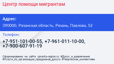 Центр помощи мигрантам по адресу 390000, Рязанская область, Рязань, Павлова, 52 в дальнейшем Организация, размещена в следующих категориях: