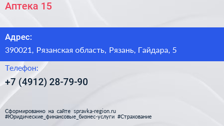 Аптека №15 по адресу 390021, Рязанская область, Рязань, Гайдара, 5 в дальнейшем Организация, размещена в следующих категориях: